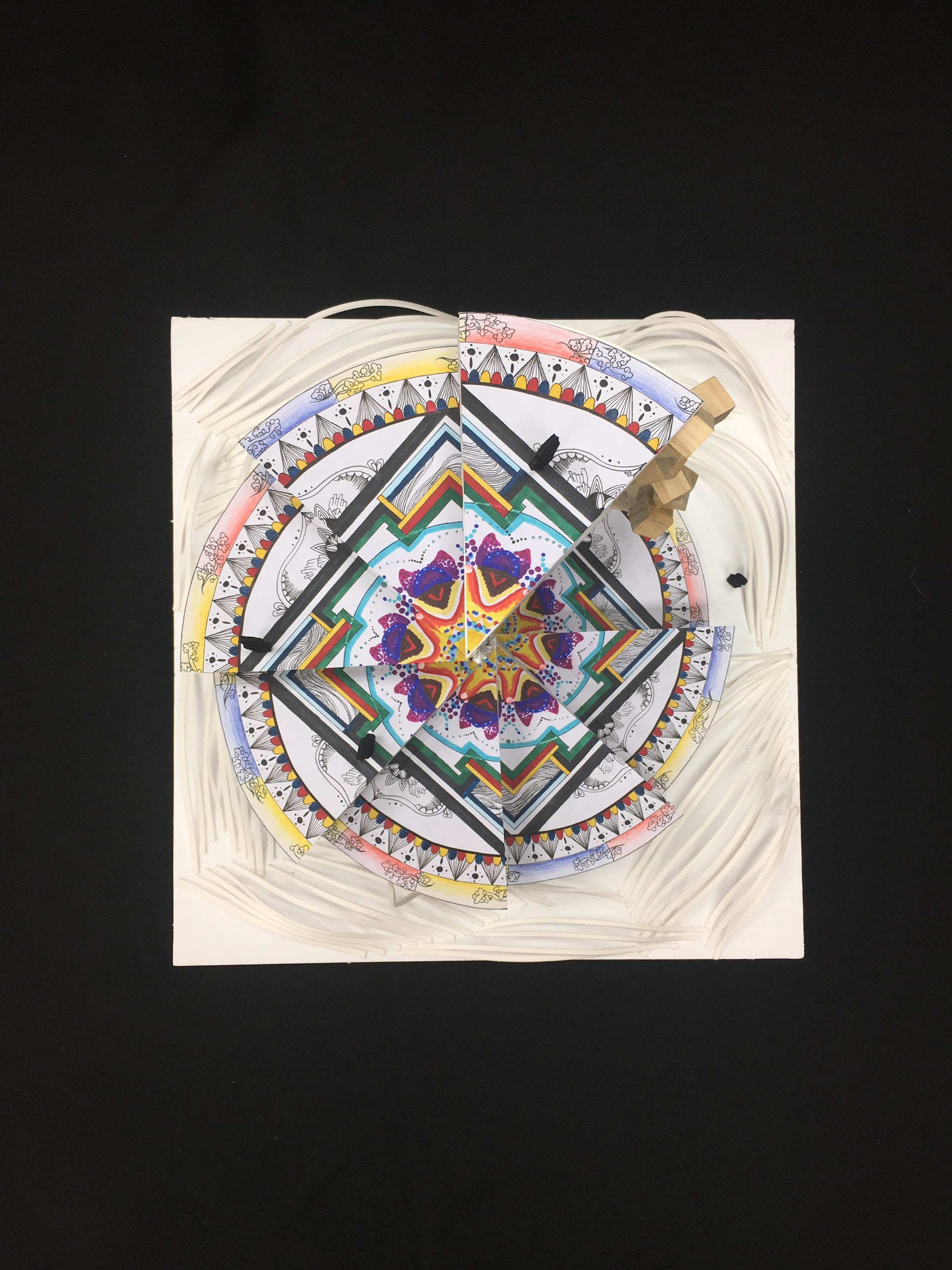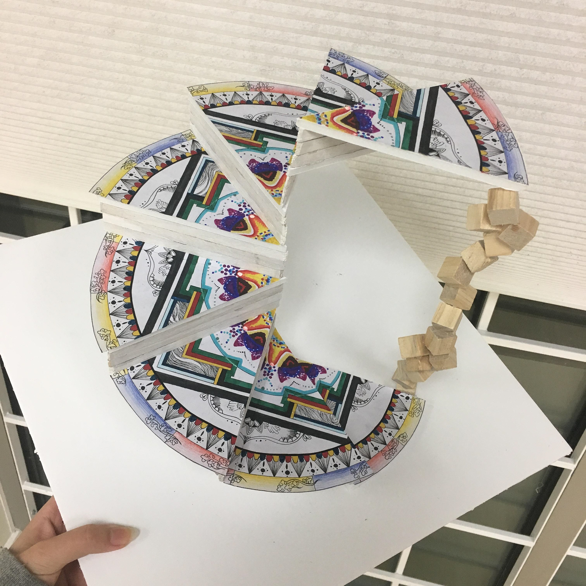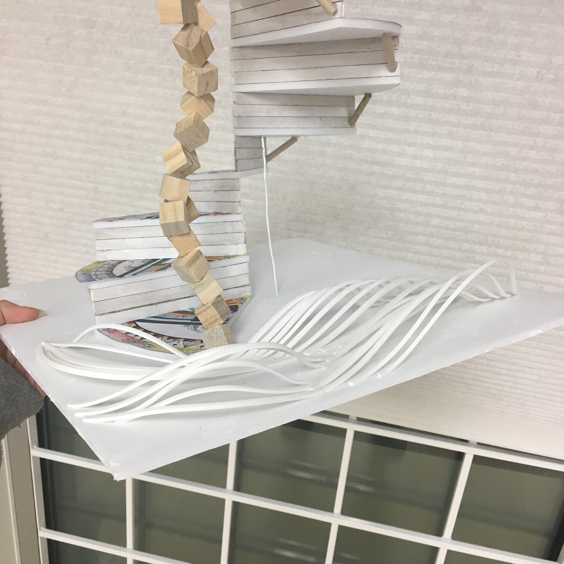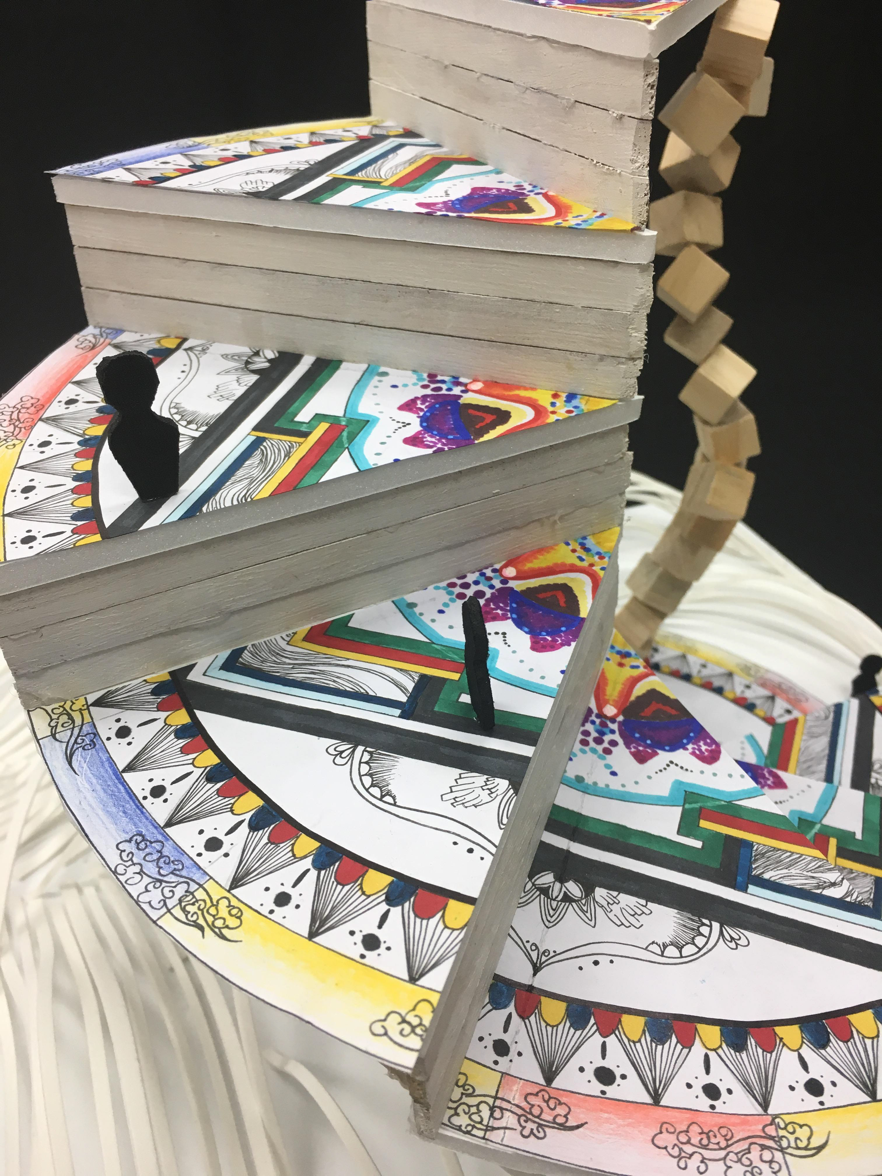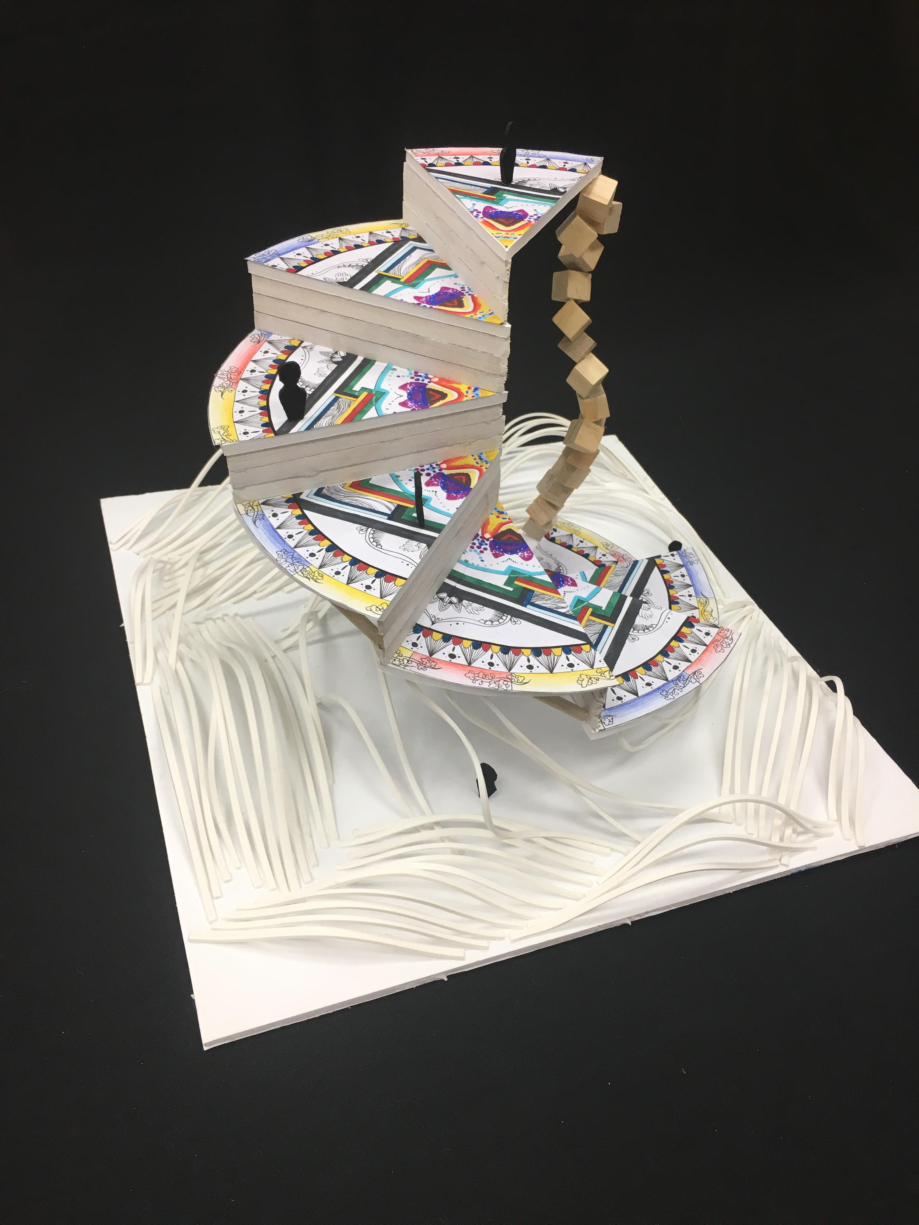This model is a building at town square. It is surrounded by noisy city and rushed people. it is an independent space that isolate people’s trouble, anger and jealous. Become a piece of pure land in the town. This was made by foam board and foam paper.